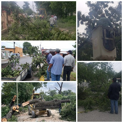 Brigadas de departamentos de Obras Públicas, Ecología, Alumbrado Público, Seguridad Pública y Protección Civil se coordinaban para trabajar en equipo y retirar escombros y restaurar daños causados en viviendas y propiedades de las familias afectadas.